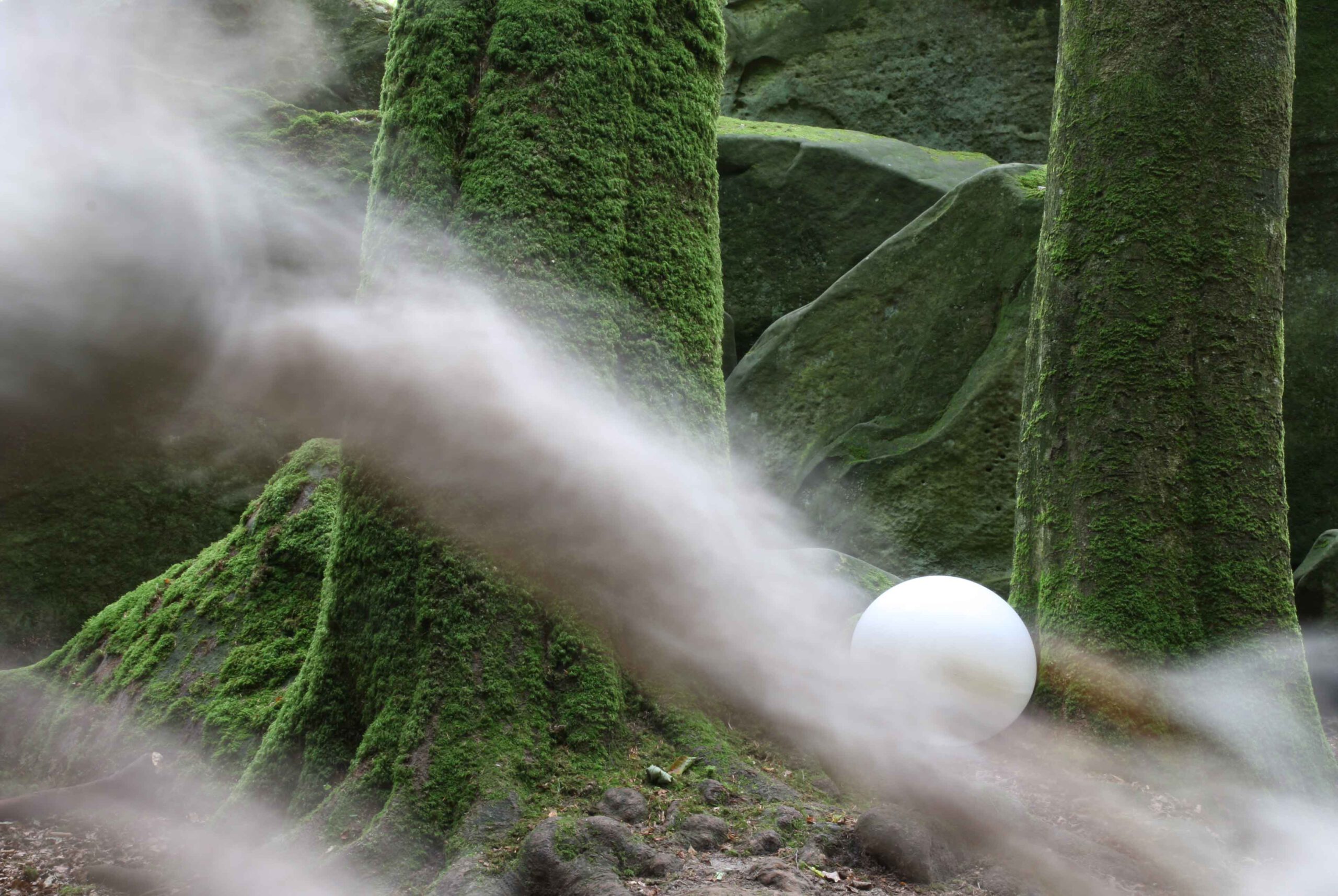 Die einmalig stattfindende Performance inmitten der Abgeschiedenheit eines Waldes spielt mit diesen Fähigkeiten eines Materials, nutzt es zugleich als Fläche, welche das Licht-Schattenspiel der umliegenden Bäume reflektiert.