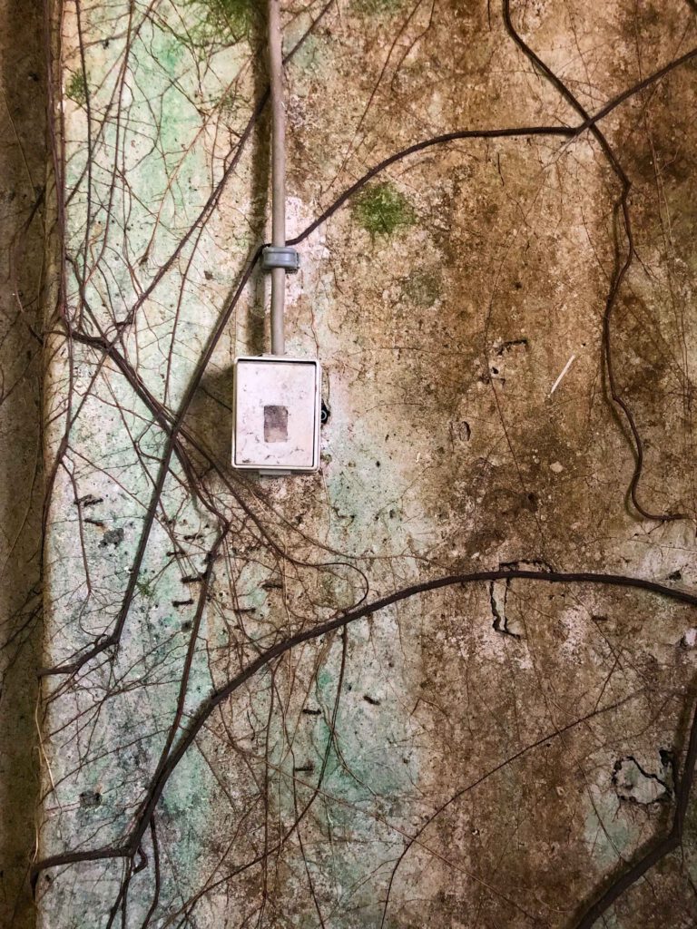 Räumliche, materielle, natürlich und von Menschen erschaffene Strukturen begegnen sich, die Verkabelung des Raums und die feinen Äste, die durch die Ritzen der Wand kriechen, bilden eine geradezu skulpturale Einheit.